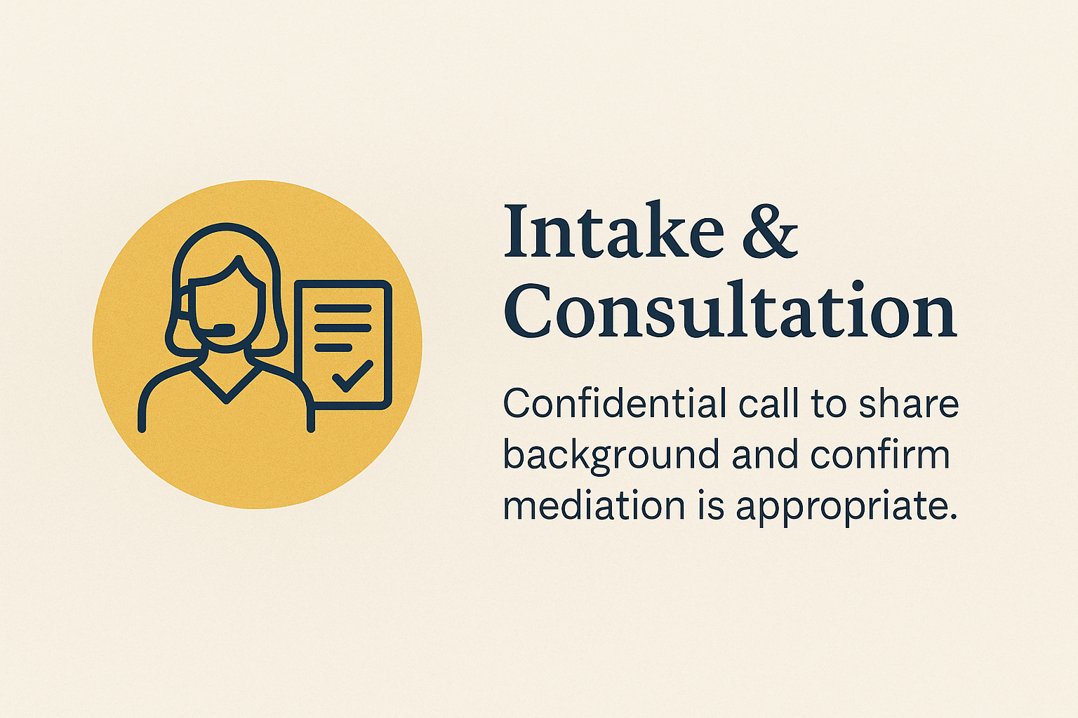 Mediation follows a clear, step-by-step process designed to move conflict toward resolution. It’s confidential, voluntary, and focused on solutions that everyone can live with. Below is what you can expect when you begin.
